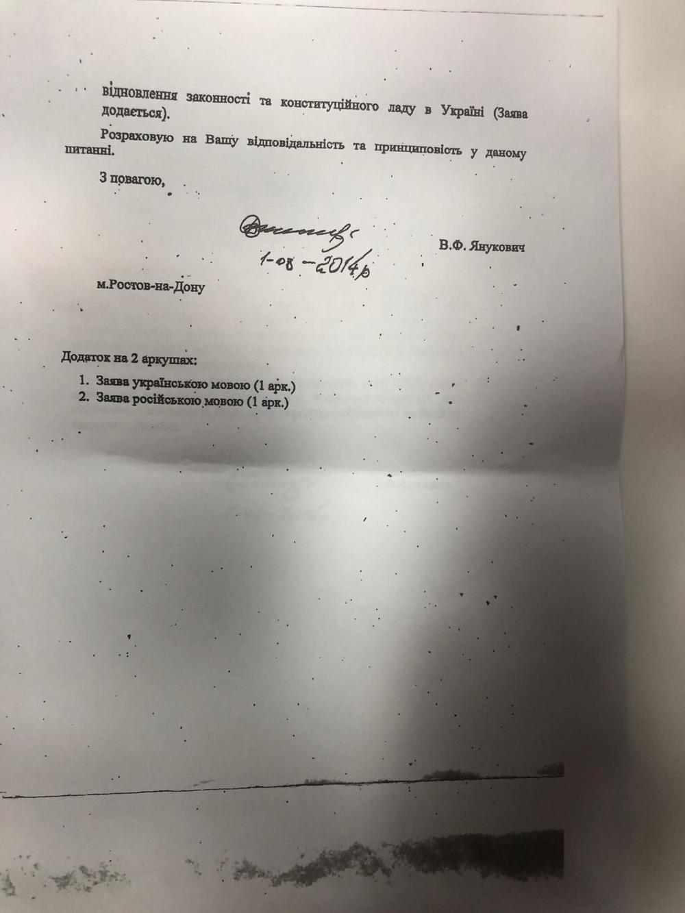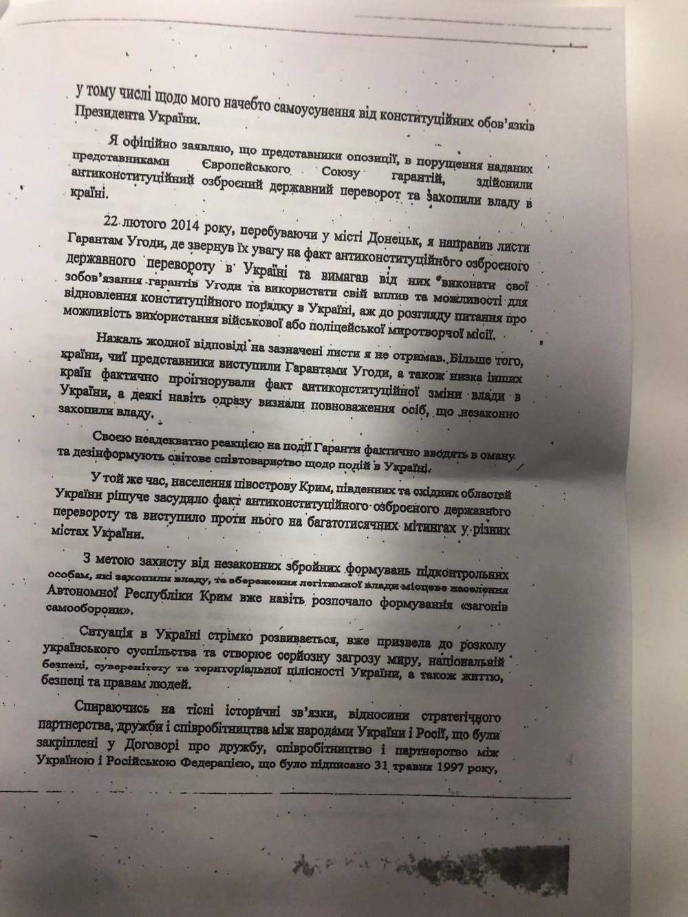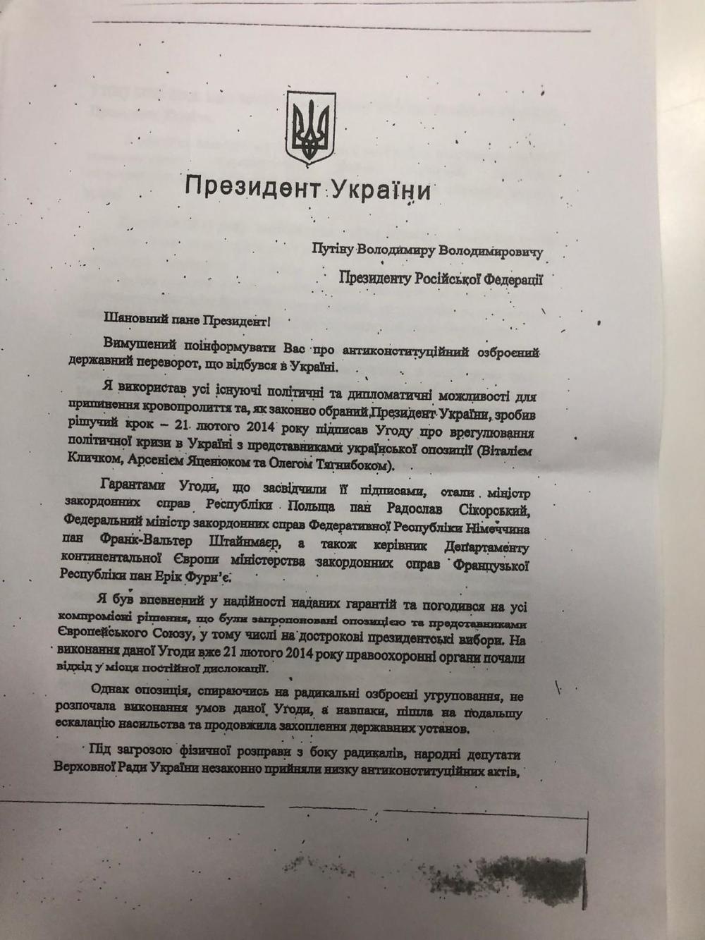 В обращении к президенту РФ Владимира Путина Виктор Янукович написал о "антиконституционном вооруженном государственном перевороте", расколе в украинском обществе, а также том, что западные страны проигнорировали "государственный переворот" в Украине в 2014 году.