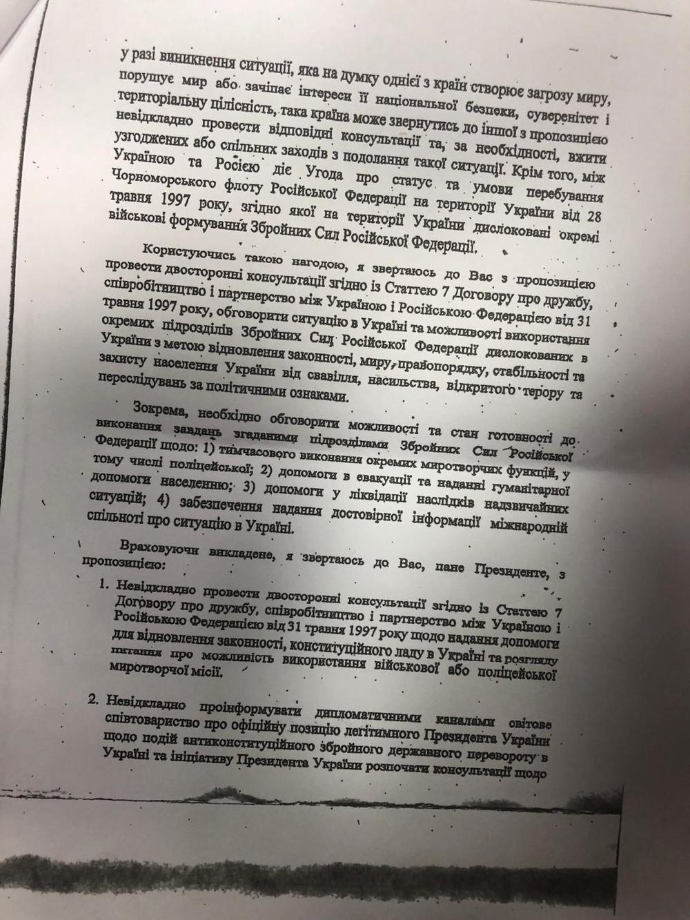 Также с обращении содержится просьба обговорить возможность введения в Украину Вооруженных сил РФ в том числе, "для временного выполнения отдельных миротворческих функций, в том числе полицейских".