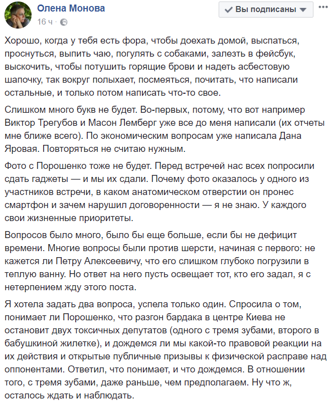 "Я когда-то писала, что Порошенко у меня ассоциируется с огромным паровозом, который если наберет скорость, то остановить его могут только взорванные впереди рельсы. На встрече это впечатление только усилилось и стало окончательным. Это тот случай, когда кажущаяся медлительность в принятии и воплощении решений компенсируется мощью и силой удара, а также набранной скоростью. То есть разгоняется только тогда, когда топлива под завязку, маршрут и цели определены, набирает скорость медленно, а набрав – уже не тормозит", – дает развернутую метафору Монова.