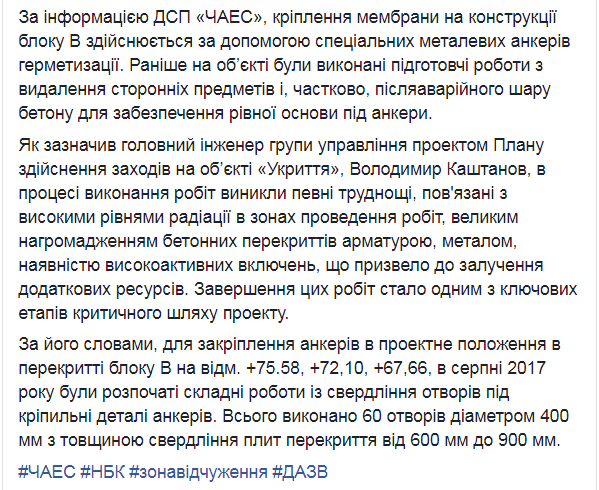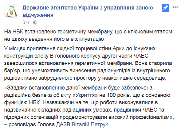 "На НБК установлено герметичную мембрану, являющуюся ключевым этапом на пути введения его в эксплуатацию В местах примыкания восточной торцевой стены Арки к существующим конструкциям блока В главного корпуса второй очереди ЧАЭС завершилось установление герметичной мембраны. Она создала барьер, что сделает невозможным вынесение радионуклидов из внутреннего радиоактивно загрязненного пространства в окружающую среду", - говорится в опубликованном сообщении.
