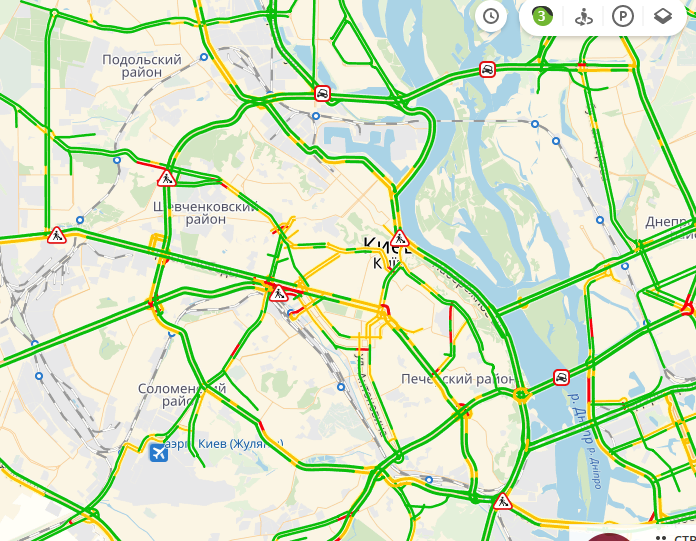 По данным сервера Яндекс-пробки, в Киеве дороги загружены на 3 балла из 10.