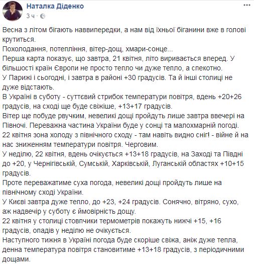 Об этом на своей странице в соцсети Facebook сообщила синоптик Наталья Диденко.