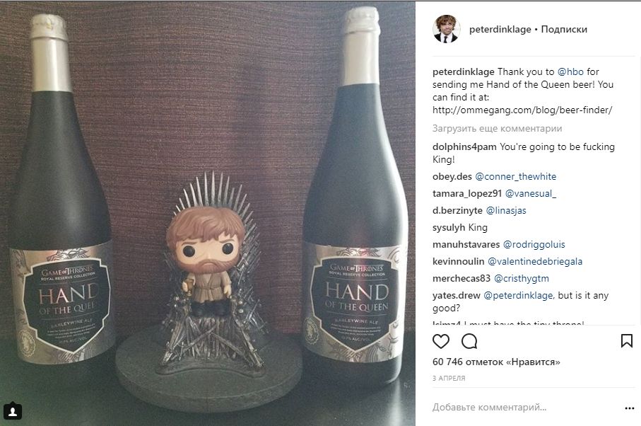 Также Динклейдж показал фигурку Тириона Ланнистера на Железном троне и бутылки пива с названием "Правая рука королевы".