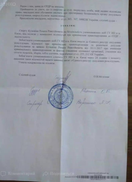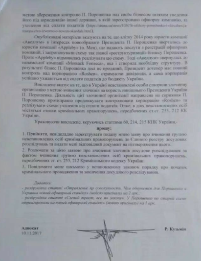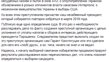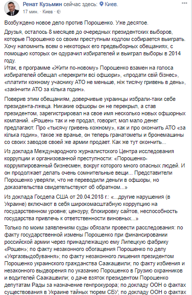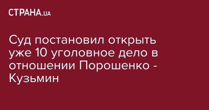 "Возбуждено новое дело против Порошенко. Уже десятое… Публикую еще одно определение суда. В этот раз о необходимости расследовать дело по факту создания преступной организации с целью уклонения от уплаты налогов и сборов в интересах действующего президента Порошенко. Следователям предстоит выяснить, создал ли эту преступную организацию сам гарант конституции или это сделали для него его "любi друзi", а он типа ничего не знал и не ведал", - написал Кузьмин.