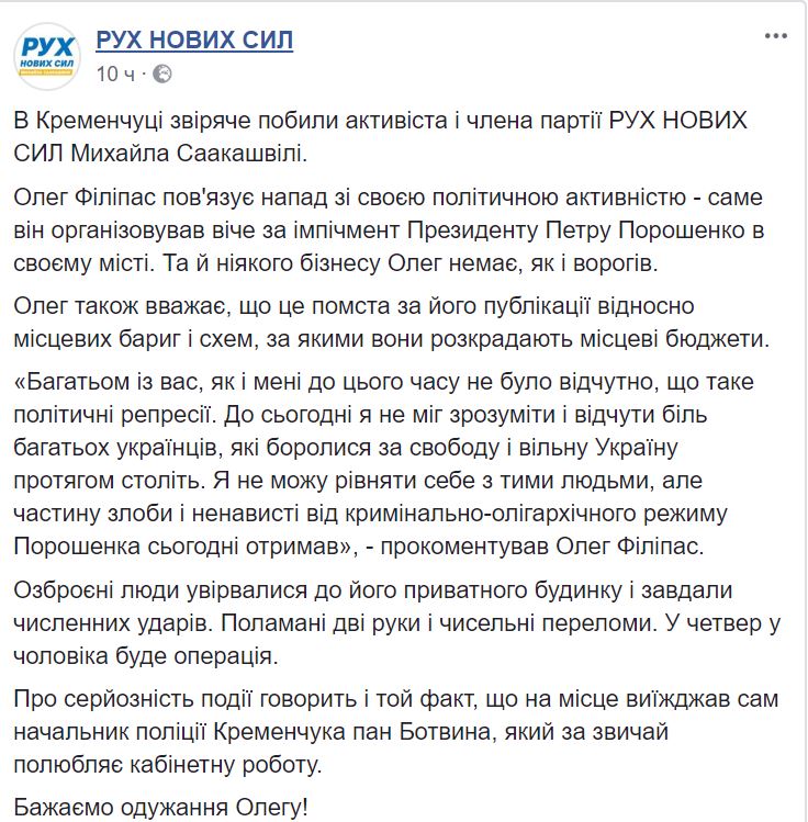 В Кременчуге Полтавской области трое неизвестных жестоко избили соратника Михаила Саакашвили, члена партии "Рух новых сил" Олега Филипаса. Об этом сообщается на странице политсилы в Facebook.