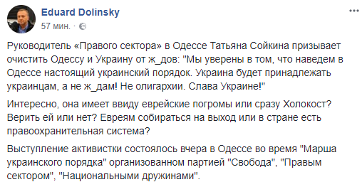 На митинге член ПС Татьяна Сойкина заявила: "Мы уверены в том, что наведем в Одессе настоящий украинский порядок. Украина будет принадлежать украинцам, а не ж*дам! Не олигархии. Слава Украине!"