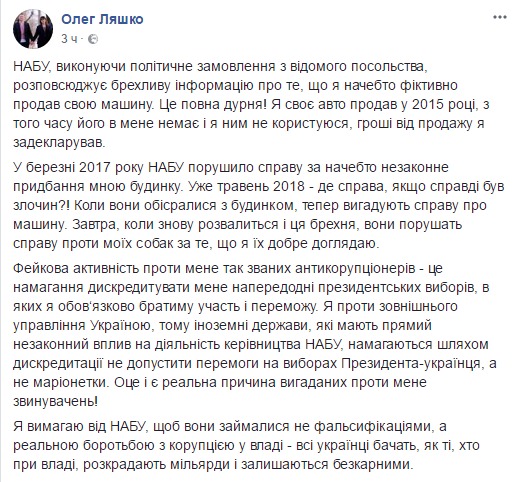 "Я свое авто продал в 2015 году, с тех пор его у меня нет и я им не пользуюсь, деньги от продажи я задекларировал. В марте 2017 НАБУ возбудило дело за якобы незаконное приобретение мной дома. Уже май 2018 - где дело, если было преступление?! Когда они обоср*лись с домом, теперь придумывают дело о машине. Завтра, когда снова развалится и эта ложь, они возбудят дело против моих собак за то, что я за ними хорошо ухаживаю. Фейковая активность против меня так называемых антикоррупционеров - это попытка дискредитировать меня в преддверии президентских выборов, в которых я обязательно буду участвовать и одержу победу. Я против внешнего управления Украиной, поэтому иностранные государства, имеющие прямое незаконное влияние на деятельность руководства НАБУ, пытаются путем дискредитации не допустить победы на выборах президента-украинца, а не марионетки. Это и есть реальная причина вымышленных против меня обвинений! Я требую от НАБУ, чтобы они занимались не фальсификациями, а реальной борьбой с коррупцией во власти - все украинцы видят, как те, кто у власти, разворовывают миллиарды и остаются безнаказанными",  - написал он.