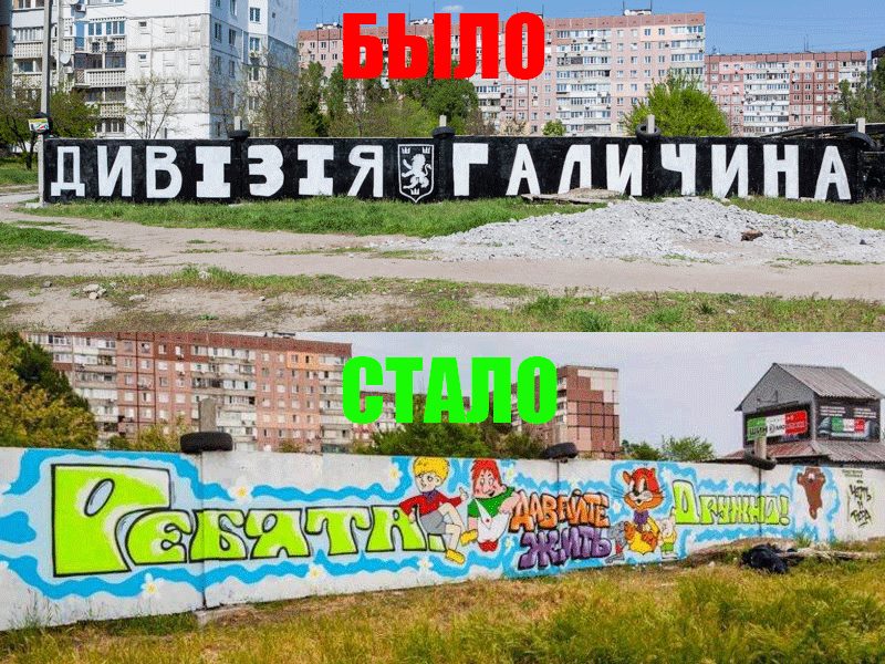 Спустя две недели, 13 мая они закрасили черный мурал новым рисунком - с мультяшными героями и надписью "Давайте жить дружно".