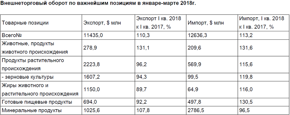 В январе-марте 2018 года экспорт товаров по сравнению с аналогичным периодом 2017 года увеличился на 10,3%, составив $11,435 млрд, импорт – на 13,2%, до $12,636 млрд.