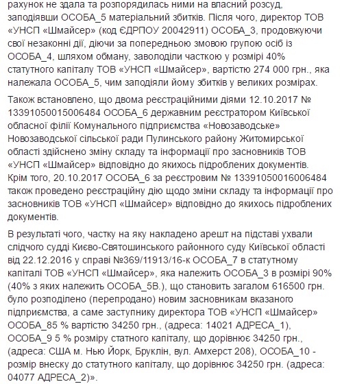 Согласно нему Герман середине декабря 2016 года внес в протокол собрания неправдивые данные. Следователь также обвинил 10%-го участника ООО в том, что совместно с владельцем на тот момент 50% доли и директором УНСП Антониной Капилян они провели без кворума собрание и незаконно исключили из состава участников владельца 40% Валерия Павлюка, который и стал инициатором этого уголовного дела, возбужденного в сентябре 2017 года.