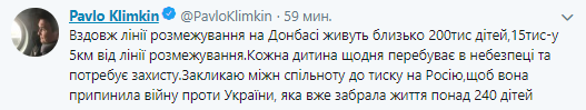 "Вдоль линии разграничения на Донбассе живут около 200 тыс. детей, 15 тыс. - в 5 км от линии разграничения. Каждый ребенок ежедневно находится в опасности и нуждается в защите. Призываю международное сообщество к давлению на Россию, чтобы она прекратила войну против Украины, которая уже унесла жизни более 240 детей", - отметил Климкин.