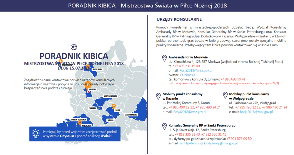 В справочнике размещены контактные данные польских консульских учреждений, информация о правилах въезда и пребывании в России и советы по личной безопасности на время турнира.