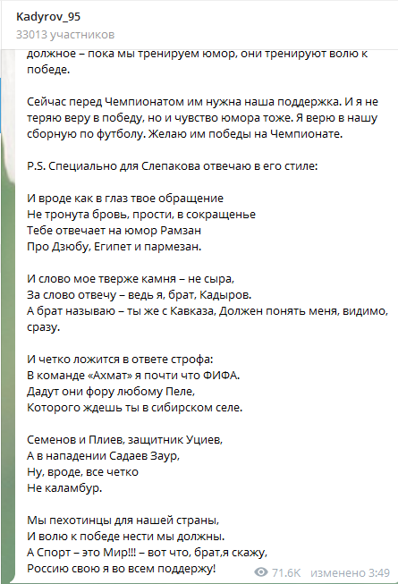 Глава Чечни также пожелал российским футболистам победы на ЧМ. В конце поста он опубликовал несколько четверостиший, в которых, по его словам, отвечает Слепакову "в его стиле".