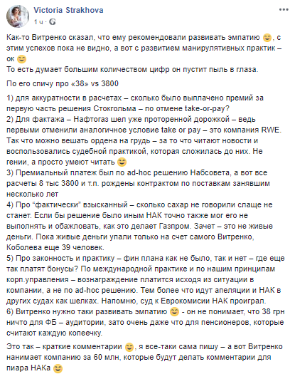 "Премиальный платеж был по ad-hoc решению Набсовета, а вот все расчеты 8 тыс 3800 и т.п. рождены контрактом по поставкам занявшим несколько лет... Пока живые деньги упали только на счет самого Витренко, Коболева и еще 39 человек... Про законность и практику - финплана как не было, так и нет - где еще так платят бонусы? По международной практике и по нашим принципам корпоративного управления - вознаграждение платится исходя из ситуации в компании, а не по ad-hoc решению. Тем более что идут апелляции и НАК в других судах как шелках. Напомню, суд к Еврокомисии НАК проиграл", - написала Страхова.