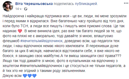 "Докажем всем, что педагоги тоже люди, и наш отдых не должен никого волновать. Я пережив очень много за эти 8 месяцев, научилась отстаивать себя, я уже никого не боюсь, я защищаю свое будущее... Давайте со мной, фото в купальниках на отдыхе с хэштегом #явчительимийвидпочинок и это касается не только педагогов, но и тех, кто не согласен с такими рода увольнениями", - написала Вита Черешневская.
