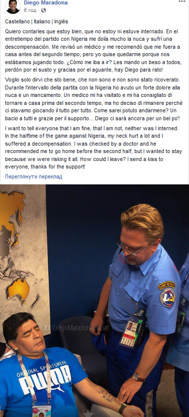 "Я хочу сказать всем, что я в порядке. В перерыве игры против Нигерии моя шея сильно заболела, и я перенес декомпенсацию. Я был осмотрен врачом, и он рекомендовал мне вернуться домой, но я хотел остаться (на стадионе - Прим. Ред.), потому что мы рисковали всем этим. Как я мог уйти? Я посылаю поцелуй всем, спасибо за поддержку!", - написал Диего.