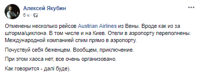 "Отменены несколько рейсов Austrian Airlines из Вены. Вроде как из за шторма/циклона. В том числе и на Киев. Отели в аэропорту переполнены. Международной компанией спим прямо в аэропорту.