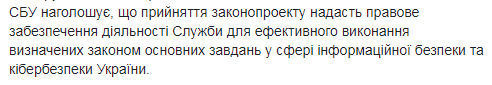 СБУ заявляет, что принятие законопроекта даст правовое обеспечение деятельности Службы для эффективного выполнения определенных законом основных задач в сфере информационной безопасности и кибербезопасности Украины", - указано в опубликованном сообщении.