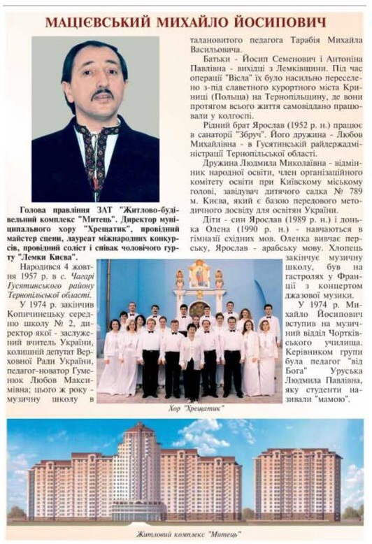 Похищенный Михаил Мациевский - личность примечательная. Совмещал музыкальное творчество со строительством. Ранее руководил муниципальным хором "Крещатик" и ЗАО жилищный комплекс "Митець", которое выступало застройщиком каскада элитных домов на улице Коновальца (бывшая Щорса), объединивший дома № 32а, № 32б, № 32в, № 32г возле Университета культуры.