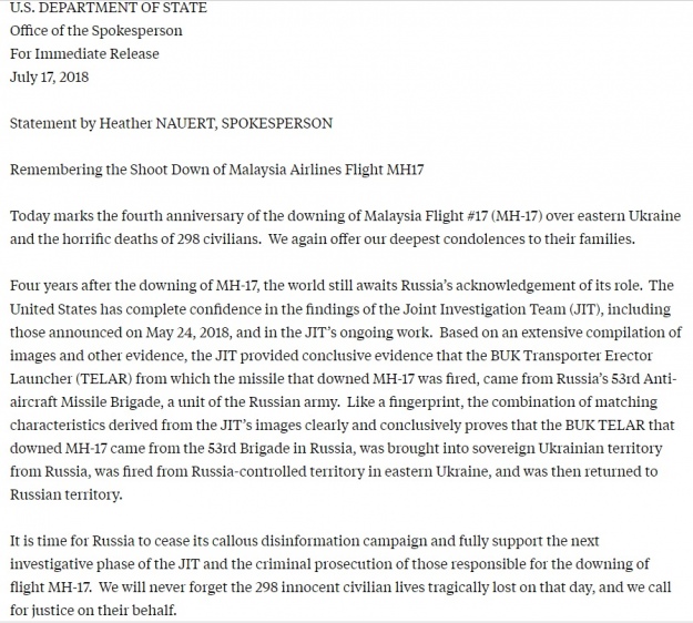 "Через четыре года после падения МН17 мир все еще ждет, пока Россия признает свою роль ... Настало время для России прекратить свою грубую кампанию по дезинформации и полностью поддерживать следующий этап расследования... и уголовное преследование тех, кто отвечает за уничтожение рейса MH17", - говорилось в черновом заявлении.