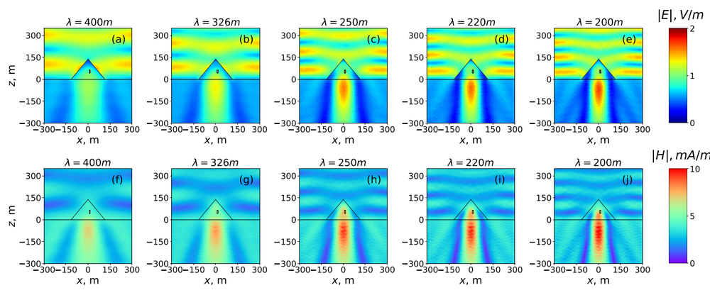 Численные расчеты, основанные на уравнениях Максвелла, показали, что оба сечения достигают максимума при длине волны около 230 и 330 метров вне зависимости от направления падающей волны. Это указывает на электромагнитные резонансы внутри пирамиды. Более того, оказывается, что на резонансной длине волны напряженность электрического поля внутри полости резко вырастает, то есть полости концентрируют электрическую энергию. Аналогичные эффекты для магнитного поля не наблюдались во всем диапазоне длин волн.