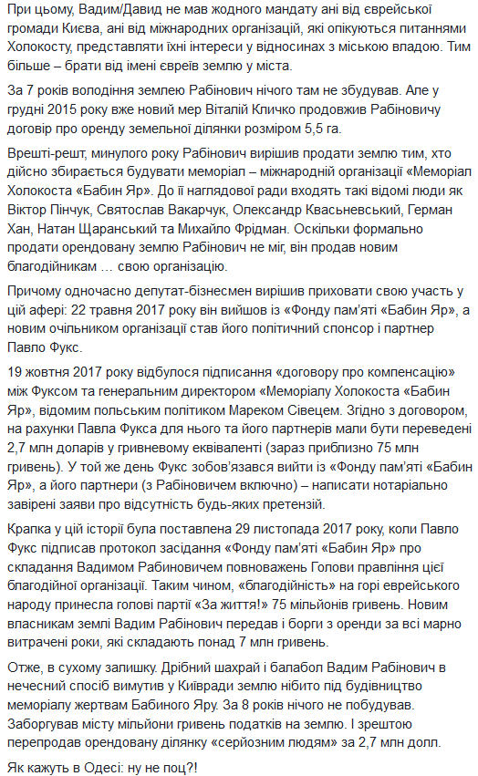 "В течение 12 лет председатель Всеукраинского еврейского конгресса, народный депутат Украины и гражданин Израиля Вадим/Давид Рабинович обещал построить Мемориал в память о погибших в Бабьем Яру. Для этого он выбил землю у киевской общины. А потом эту землю... продал.