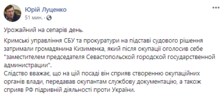 "Следствие считает, что на этом посту он способствовал созданию оккупационных органов власти, передавал оккупантам служебную документацию, а также способствовал РФ подрывной деятельности против Украины", - сообщил Луценко.
