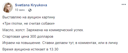 Аукцион стартовал сегодня в 12:00 и заканчивается в 13:30. Стартовая цена полотна - 300 долларов. Об этом на своей странице в Facebook написала заместитель главного редактора "Страны" Светлана Крюкова.