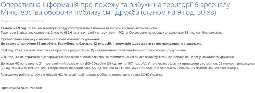 "Интенсивность взрывов составляет один взрыв на 4-5 минут. Всего привлечено к локализации и ликвидации чрезвычайной ситуации 230 военнослужащих и 43 единицы техники пожарных и инженерных подразделений Вооруженных сил Украины. В частности: пожарных танка ГПМ-54, пожарные автомобили, инженерные машины разграждения ИМР-2, беспилотные летательные аппараты для аэроразведки", – отметили в Генштабе.