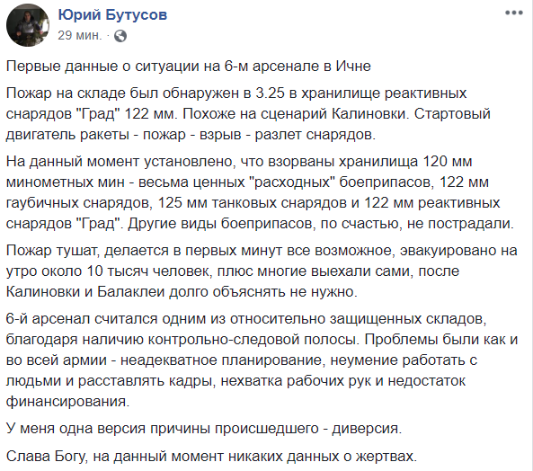 11:27  "Пожар на складе был обнаружен в 3.25 в хранилище реактивных снарядов "Град" 122 мм. Похоже на сценарий Калиновки. Стартовый двигатель ракеты - пожар - взрыв - разлет снарядов", - пишет в Facebook журналист Юрий Бутусов.