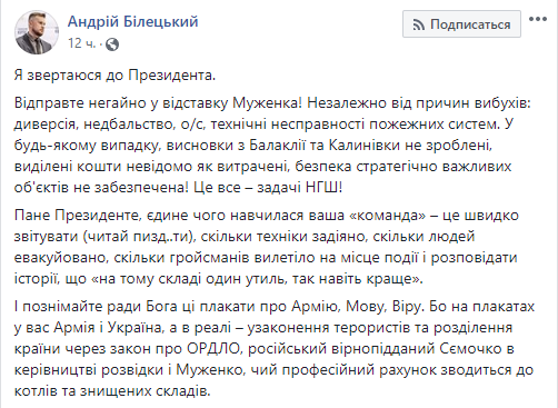 23:10 Народный депутат и лидер партии "Национальный корпус" Андрей Билецкий после взрывов в Ичне потребовал отправить в отставку главу Генштаба Виктора Муженко. Об этом он написал в Facebook.