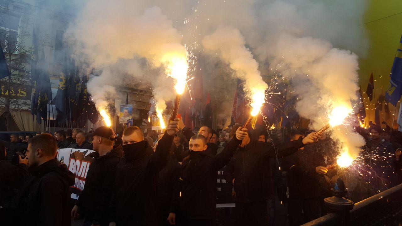 В воскресенье, 14 октября, в Киеве на марше УПА участники шествия зажгли файеры. На Крещатике стоят столбы дыма, всю улицу затянуло густым сине-желтым облаком. Участники шествия выкрикивают: "Бандера наш герой!", "Ганьба!", "На ножи", "буде Украина вільна".
