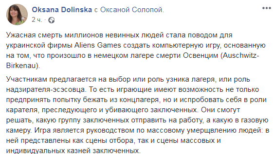 "Игра является руководством по массовому умерщвлению людей: в ней представлены как сцены отбора, так и сцены массовых и индивидуальных казней заключенных", - говорится на Facebook-странице Оксаны Долинской.