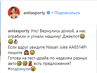 "Упс! Вернулись домой, а нас ограбили и угнали машину! Джекпот. Если вдруг увидите Nissan Juke АА8314PI, пишите", - подписала Анита фото с еще неугнанным белым авто.