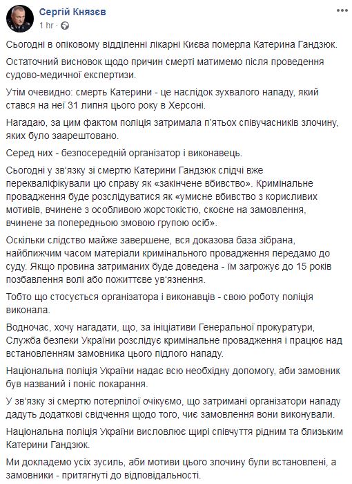"Сегодня в ожоговом отделении больницы Киева умерла Екатерина Гандзюк. Окончательный вывод о причинах смерти будем иметь после проведения судебно-медицинской экспертизы. Впрочем очевидно: смерть Екатерины - это следствие дерзкого нападения, произошедшего на нее 31 июля этого года в Херсоне… В связи со смертью потерпевшей ожидаем, что задержанные организаторы нападения дадут дополнительные свидетельства о том, чей заказ они выполняли", - написал Князев.