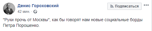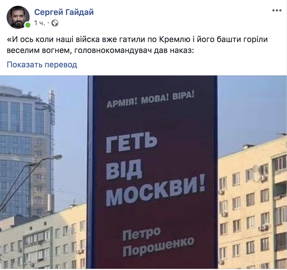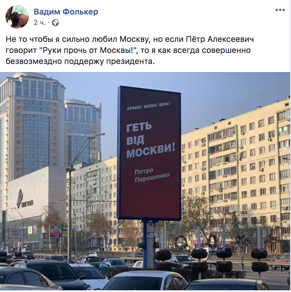 "На рекламных щитах размещен слоган "Геть від Москви". "Руки прочь от Москвы", - как бы говорят нам новые социальные борды Петра Порошенко", - пишет блогер Гороховский.