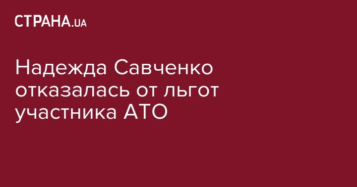 Народный депутат Надежда Савченко (фракция "Батькивщина") сообщила ночью в четверг, что отказалась от статуса участника антитеррористической операции, а также от положенных по этому статусу льгот. Об этом она написала на своей странице в Facebook