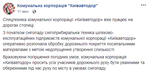 !Учитывая ухудшение погодных условий, коммунальная корпорация "Киевавтодор" просит всех участников дорожного движения быть внимательными и осторожными при движении по городу в условиях снегопада", - говорится в сообщении коммунального предприятия.