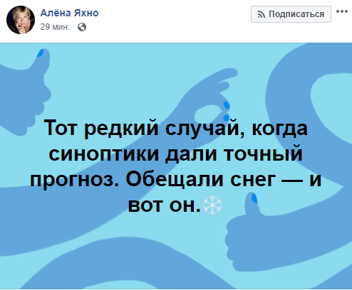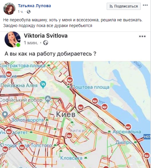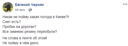 "Никак не пойму какая погода в Киеве?! Снег есть? Пробки на дорогах? Все зимнюю резину переобули? Ни слова в ленте об этом! Не пойму в чём дело".