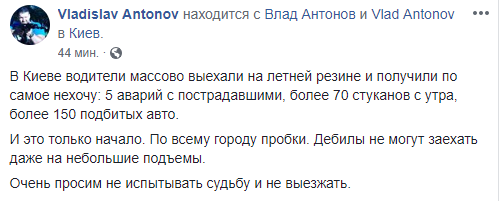 Основатель dtp.kiev.ua Влад Антонов сообщил, что утром в Киеве были зафиксированы 5 аварий с пострадавшими, более 70 столкновений авто, более 150 подбитых машин.