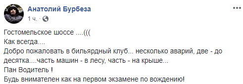 "Гостомельское шоссе ....((( Как всегда....  Добро пожаловать в бильярдный клуб... несколько аварий, две - до десятка....часть машин - в лесу, часть - на крыше... Пан Водитель! Будь внимателен как на первом экзамене по вождению!"