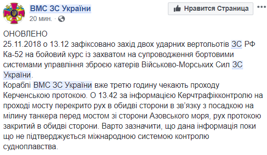 "О намерении осуществлять переход заранее были проинформированы в соответствии с международными нормами в целях обеспечения безопасности судоходства. Однако, вопреки Конвенции ООН по морскому праву и Договора между Украиной и Российской Федерацией о сотрудничестве в использовании Азовского моря и Керченского пролива, пограничные корабли РФ - пограничные катера типа "Соболь", ПСКР "Дон", катера типа "Мангуст", МПК "Суздалец "осуществили откровенно агрессивные действия против кораблей ВМС ВС Украины", - сказано в сообщении.