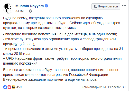 Депутаты Верховной Рады готовы на введение военного положения в Украине только с учетом некоторых поправок, касающихся его сроков, президентских выборов 2019 года и ограничения прав граждан. Об этом написал нардеп Мустафа Найем на своей странице в Facebook.