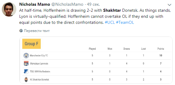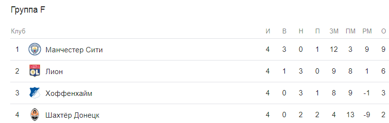 Пока первое место в группе занимает Манчестер Сити с 9 очками. На второй строчке Лион с 6 пунктами. На третьем - Хоффенхайм (3 очка). На четвертом месте Шахтер (2 очка).