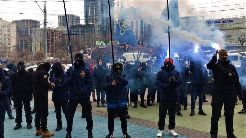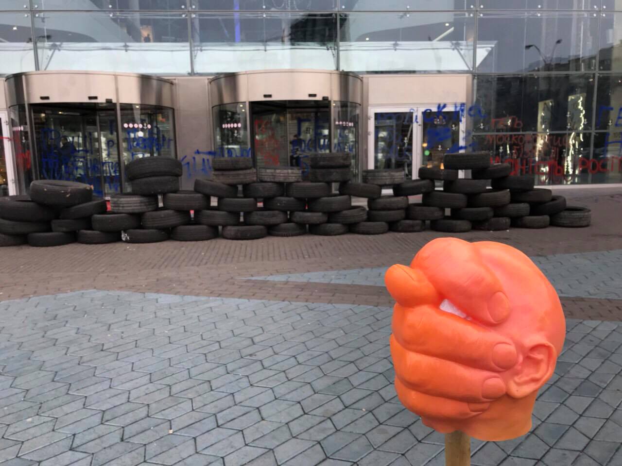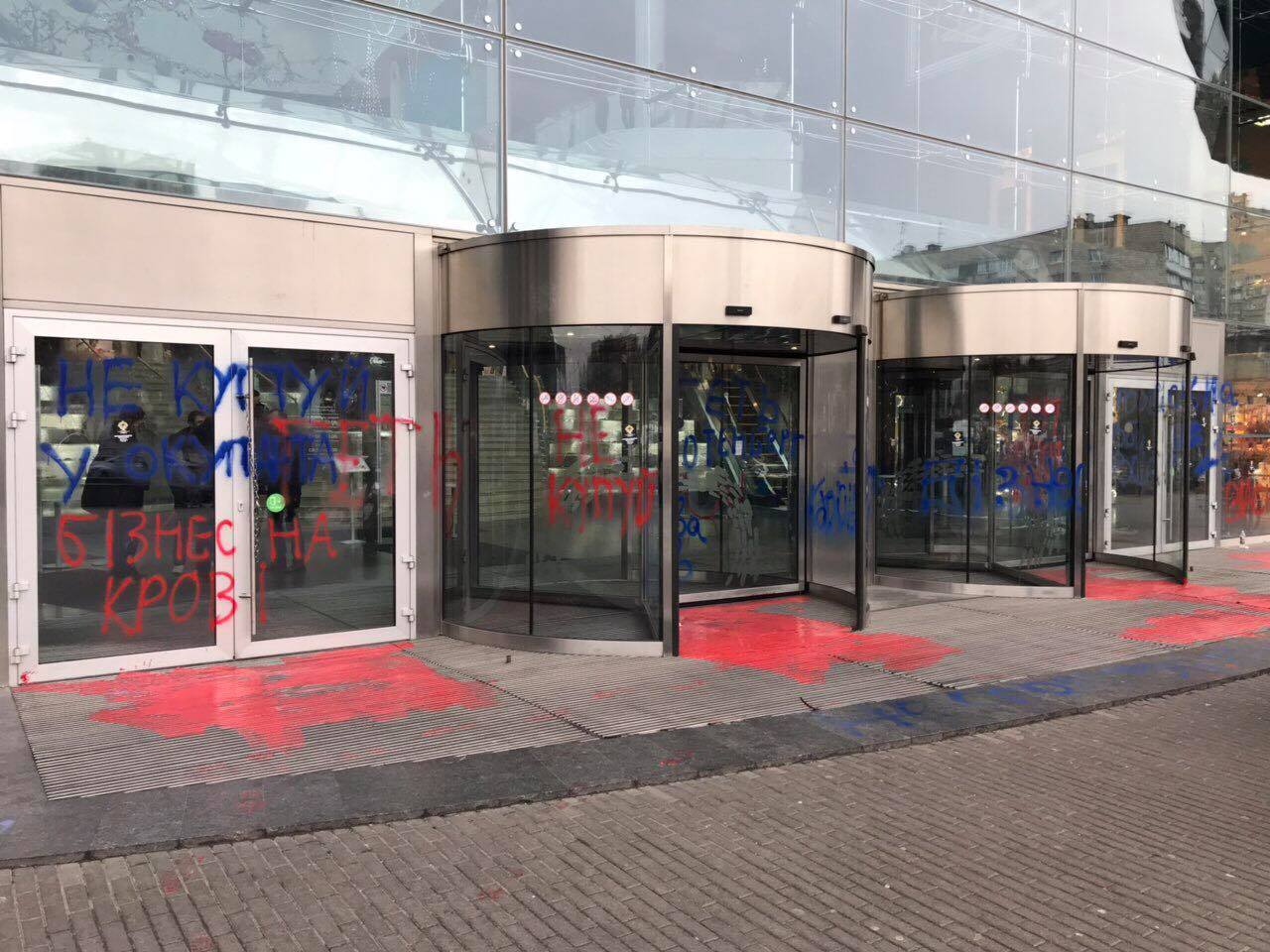 С утра под зданием ТРЦ на Антоновича собрались около 50 представителей националистических организаций (большинство из "Сокола" - молодежной организации "Свободы"). Они принесли шины ко входу в Ocean Plaza, а стены и двери разрисовали надписями "Бизнес на крови", "Прочь московский бизнес", "Не покупай в Ocean Plaza" и т.д.