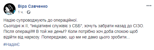 По информации Веры Савченко, Надежду сопровождали охранники в операционную, также прямо после процедуры ее заберут обратно в СИЗО.