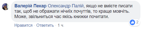 Политолог Михаил Чаплыга отметил, что пост Палия понравился пресс-секретарю генпрокурора Ларисе Сарган. "Глянь, что пишут твои рупоры и кто это лайкает!", - обратился Чаплыга к Петру Порошенко.