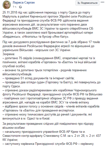 В ближайшее время Украина направит подозрения в причастности к агрессии по отношению к ВМС Вооруженных сил Украины еще десяти российским военнослужащим. Об этом на своей странице в Facebook сообщила пресс-секретарь генерального прокурора Украины Лариса Сарган.