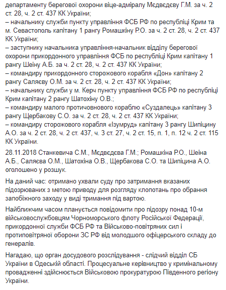 При этом восьмерым российским военнослужащим уже сообщено о подозрении. Они объявлены в розыск. Их фамилии были опубликованы 27 ноября