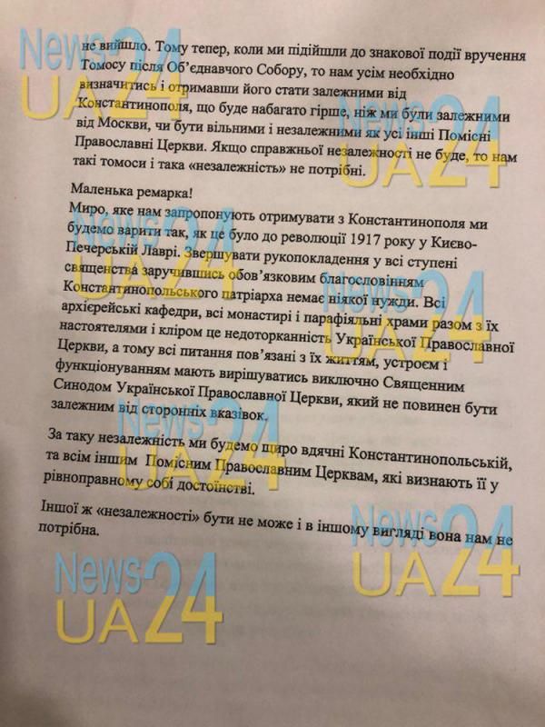 Также митрополит указывает на то, что все архиерейские кафедры, монастыри и общинные храмы вместе с их настоятелями и клиром являются неприкосновенной частью Украинской православной церкви. В связи с этим все вопросы, связанные с их функционированием и жизнью должны решаться исключительно Священным синодом Украинской православной церкви, который не должен быть зависимым от внешних указаний.